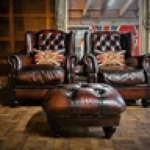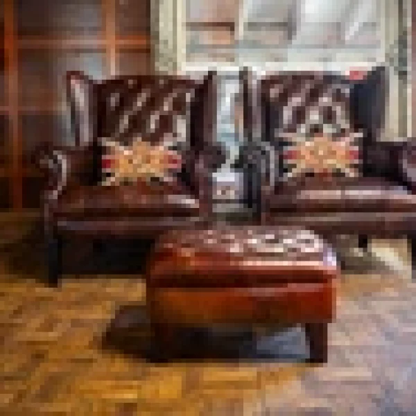 F50-160326/E- PAIR of TETRAD OSKAR ANTIQUE CIGAR LEATHER CHESTERFIELD WINGBACK CHAIRS & STOOL