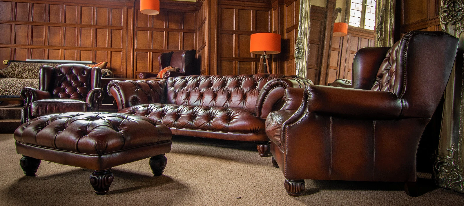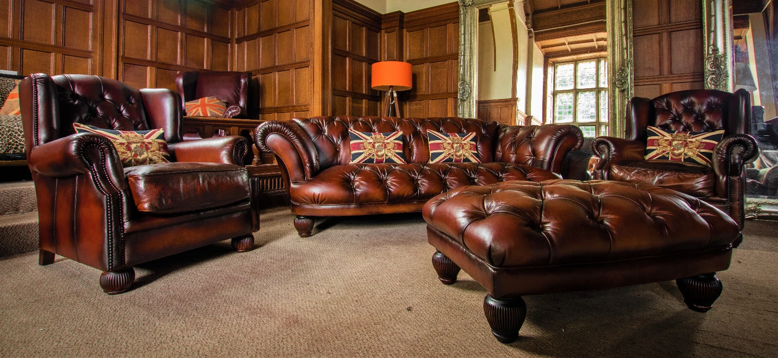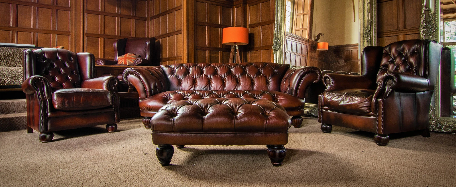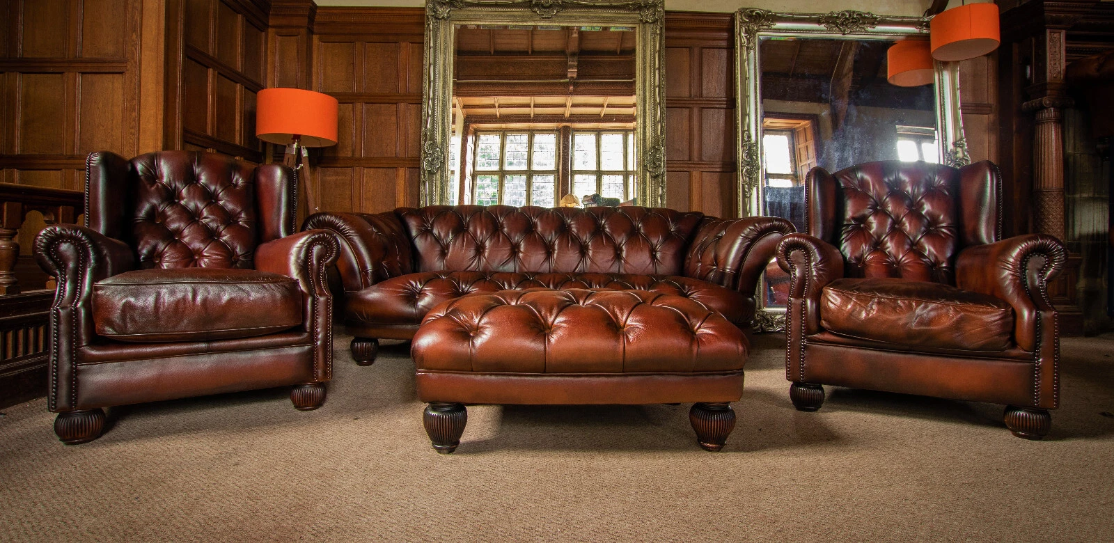 TETRAD OSKAR CHESTERFIELD CONKER LEATHER MIDI SOFA PAIR of WING CHAIRS & STOOL