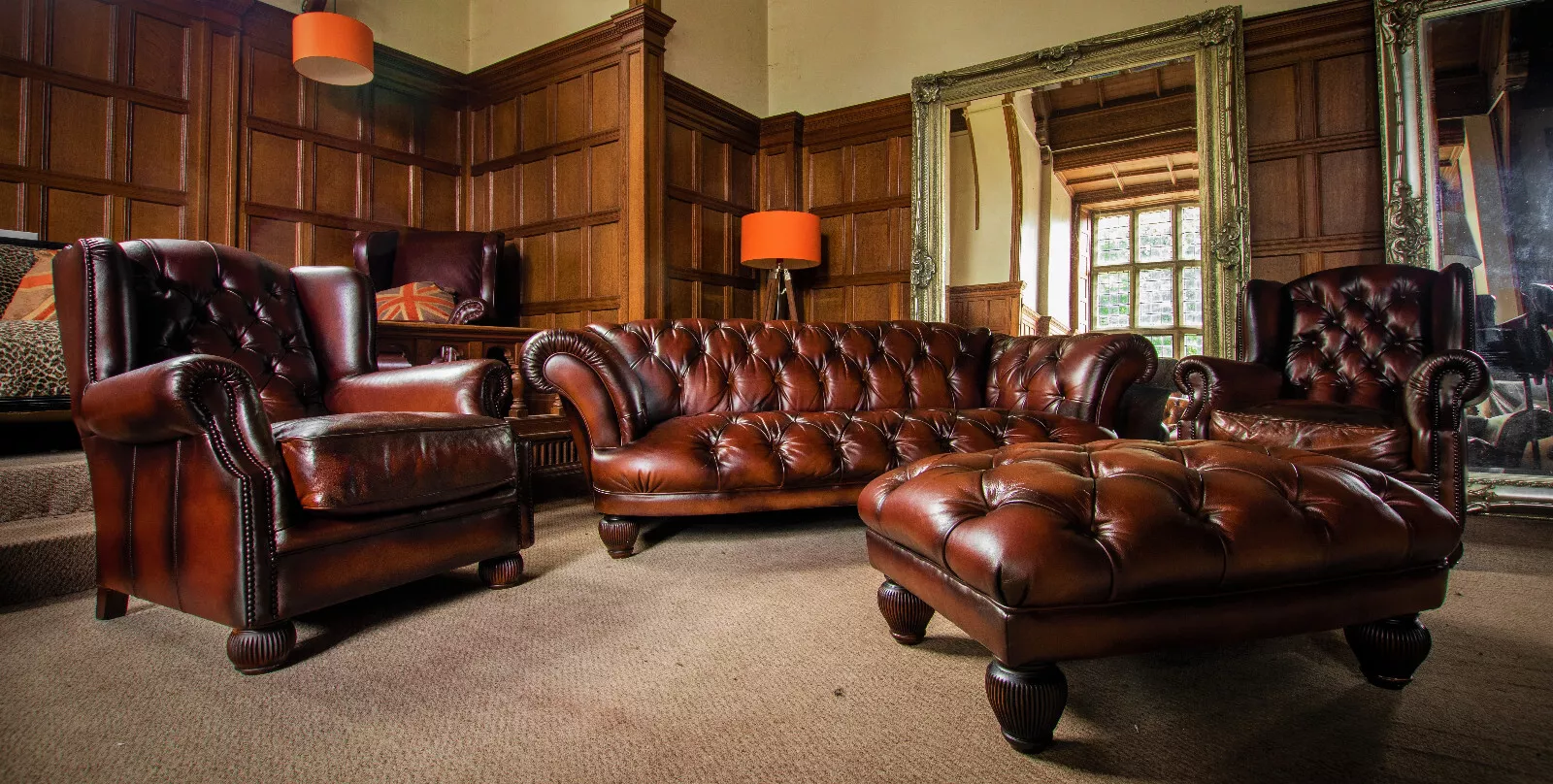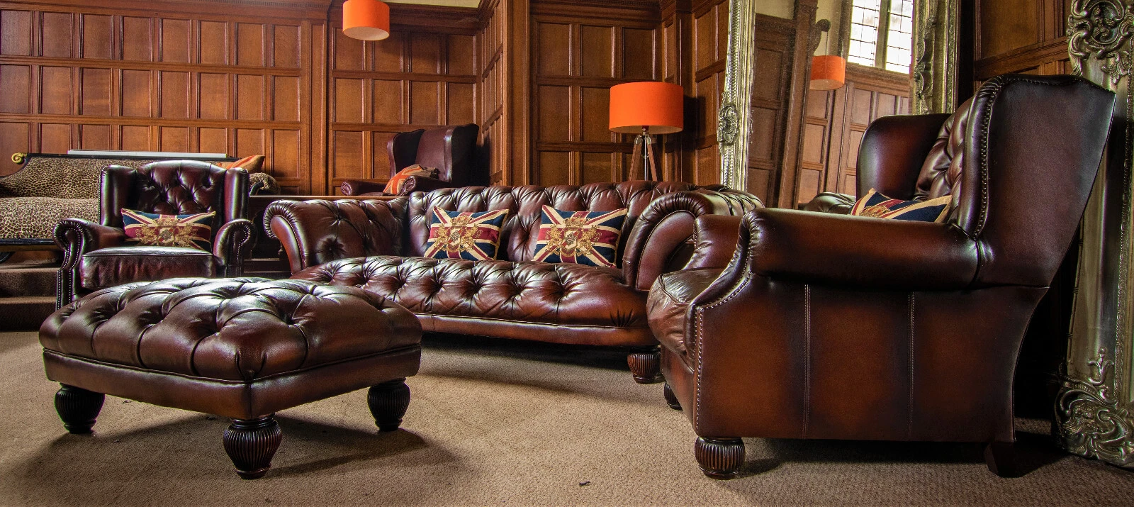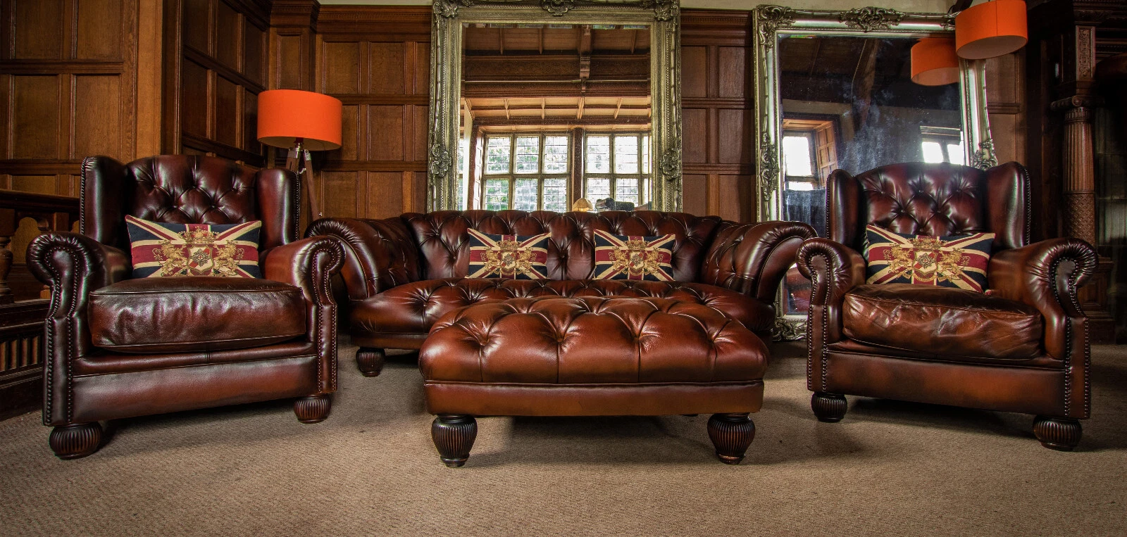 TETRAD OSKAR CHESTERFIELD CONKER LEATHER MIDI SOFA PAIR of WING CHAIRS & STOOL