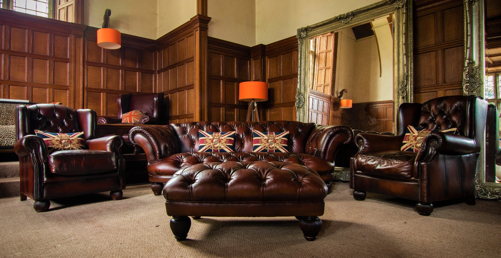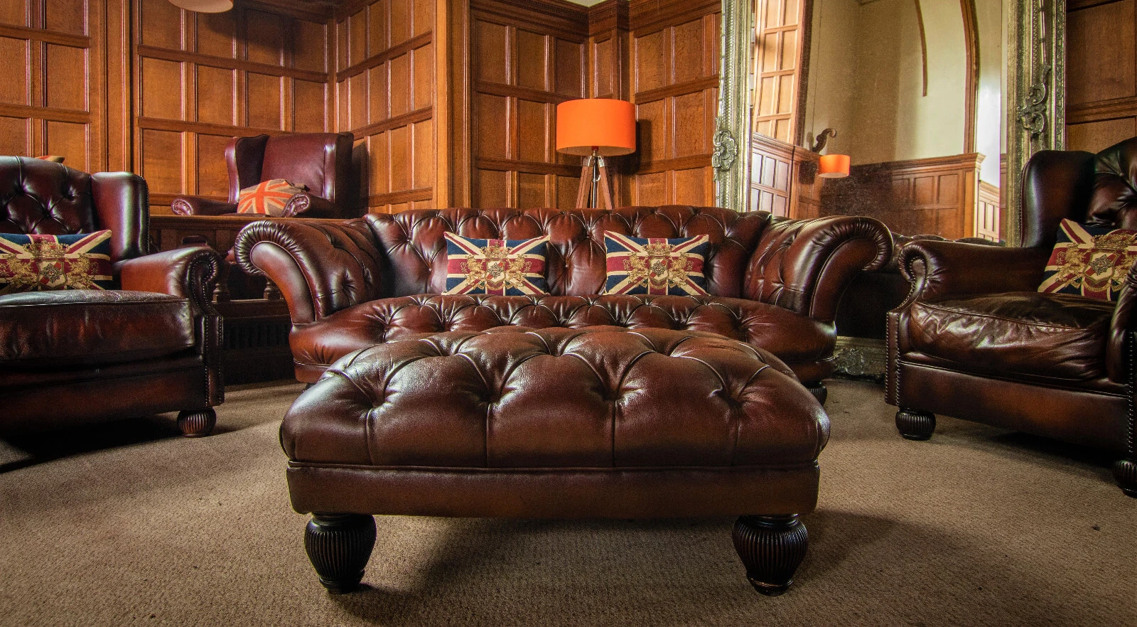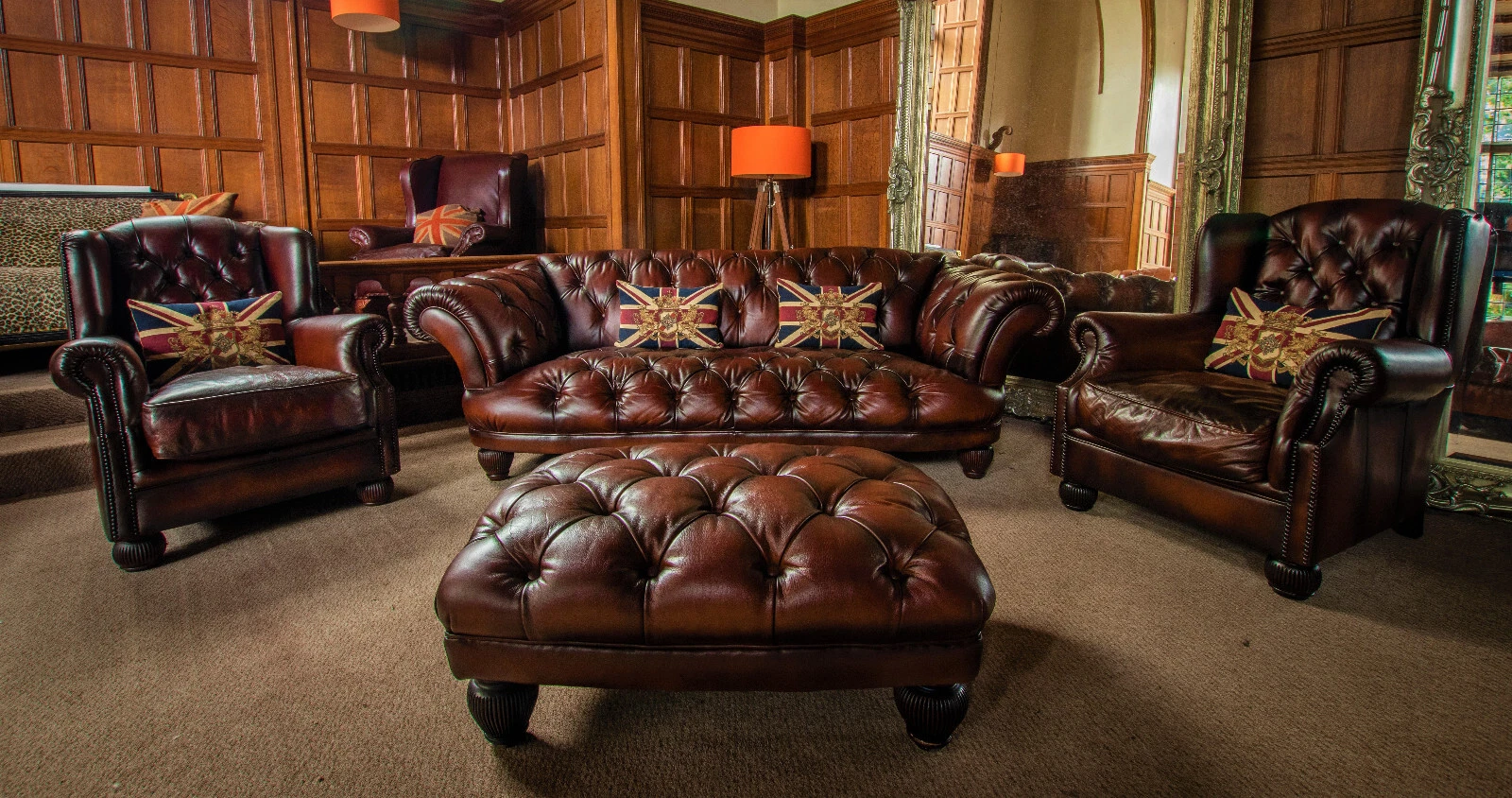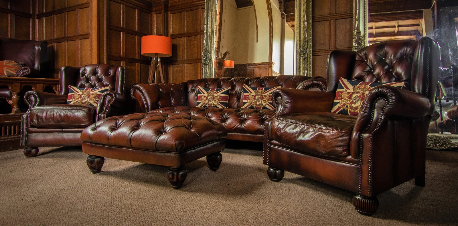 TETRAD OSKAR CHESTERFIELD CONKER LEATHER MIDI SOFA PAIR of WING CHAIRS & STOOL