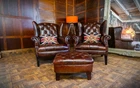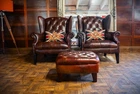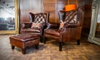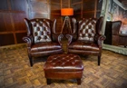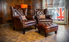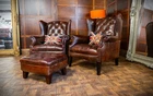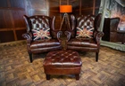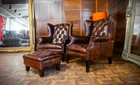 PAIR of TETRAD PALACE ANTIQUE BROWN LEATHER CHESTERFIELD WINGBACK CHAIRS & STOOL