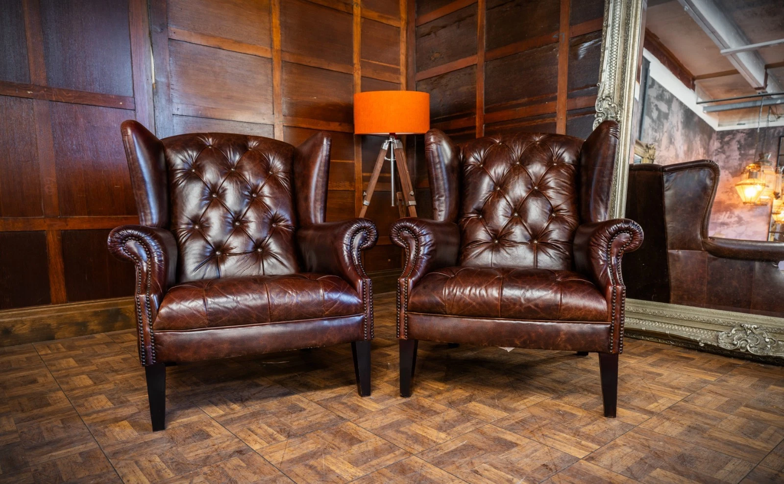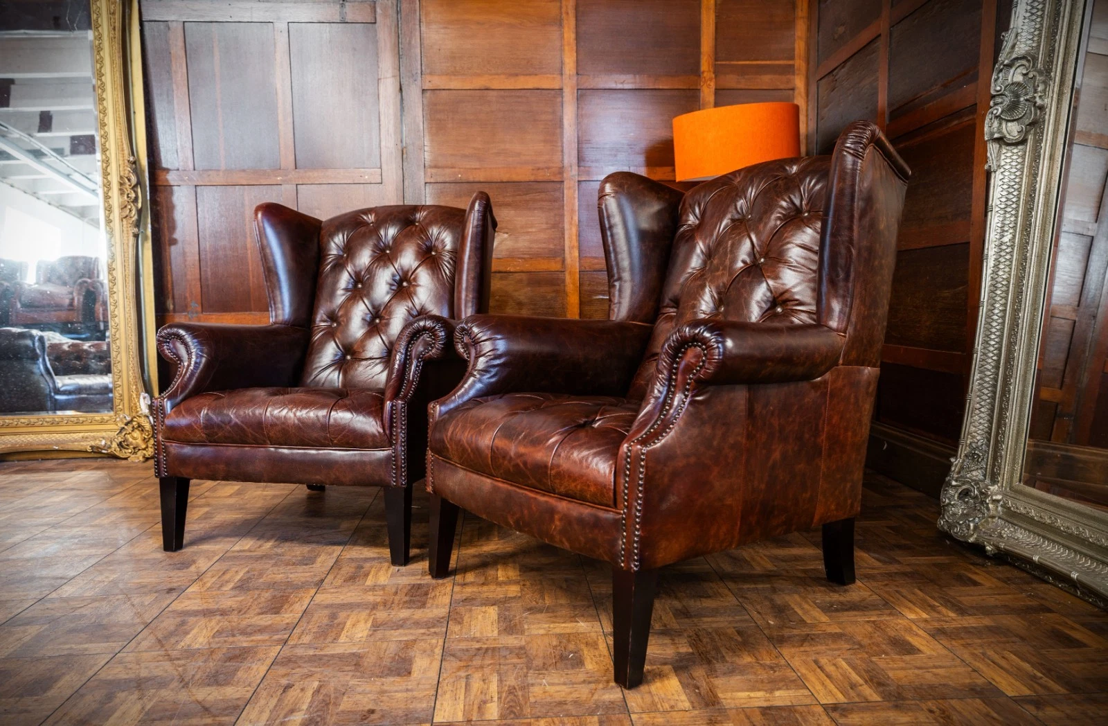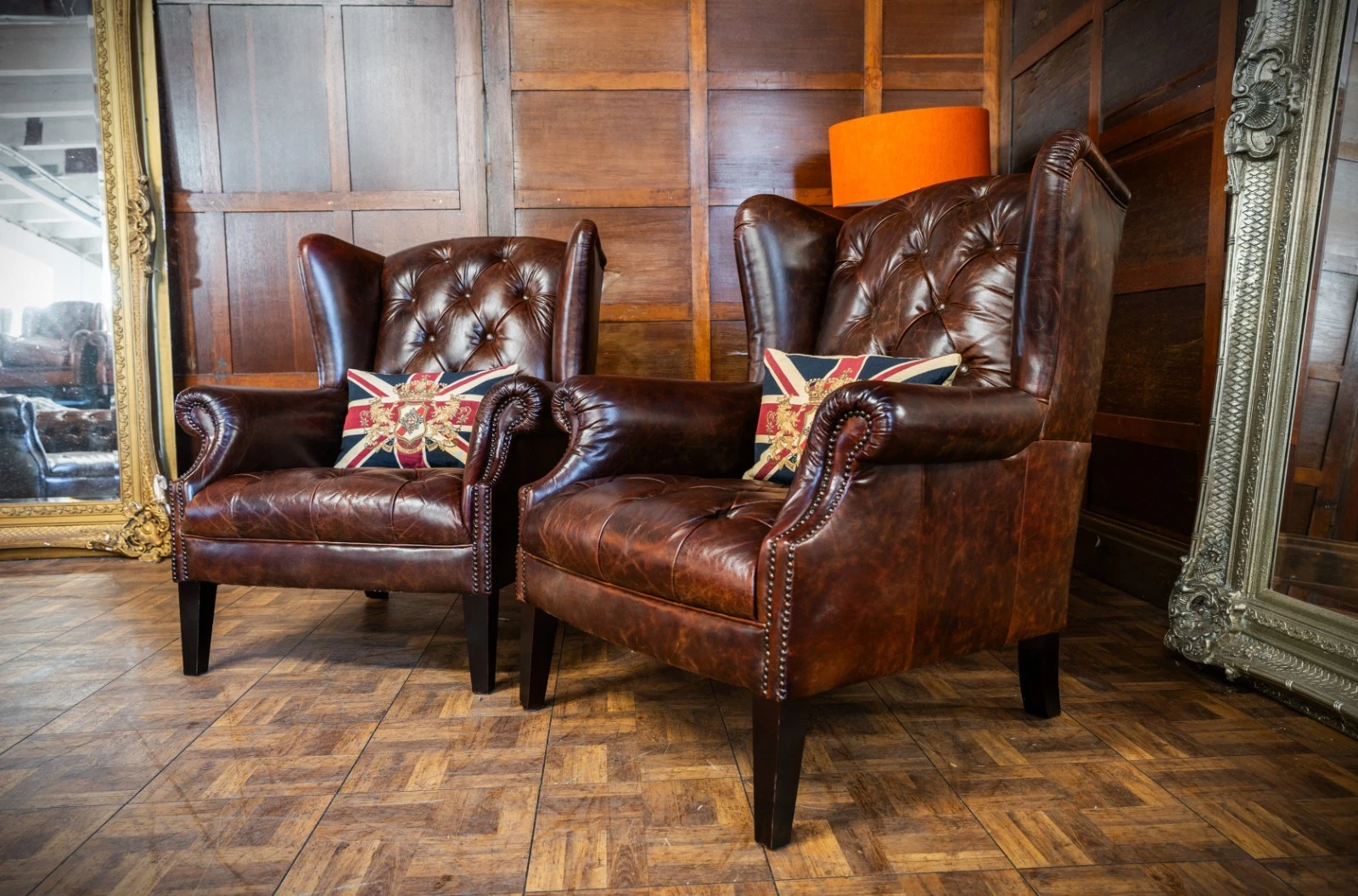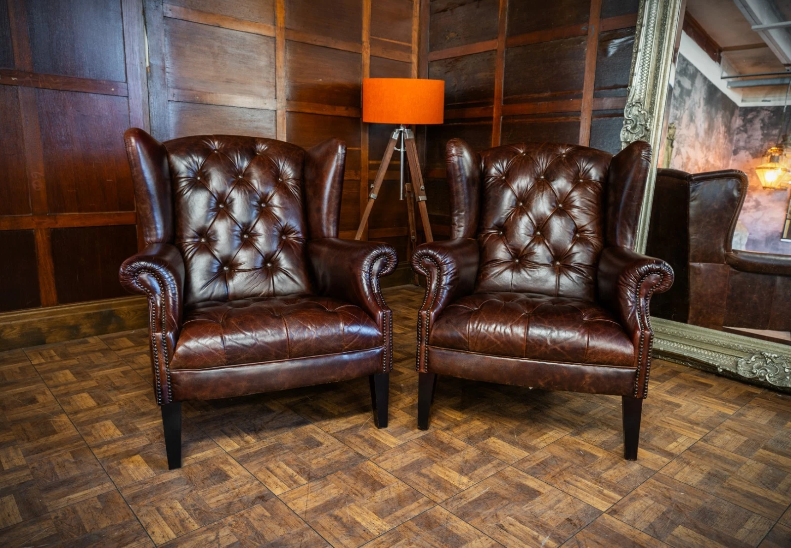 PAIR of TETRAD PALACE ANTIQUE BROWN LEATHER CHESTERFIELD WINGBACK LIBRARY CHAIRS