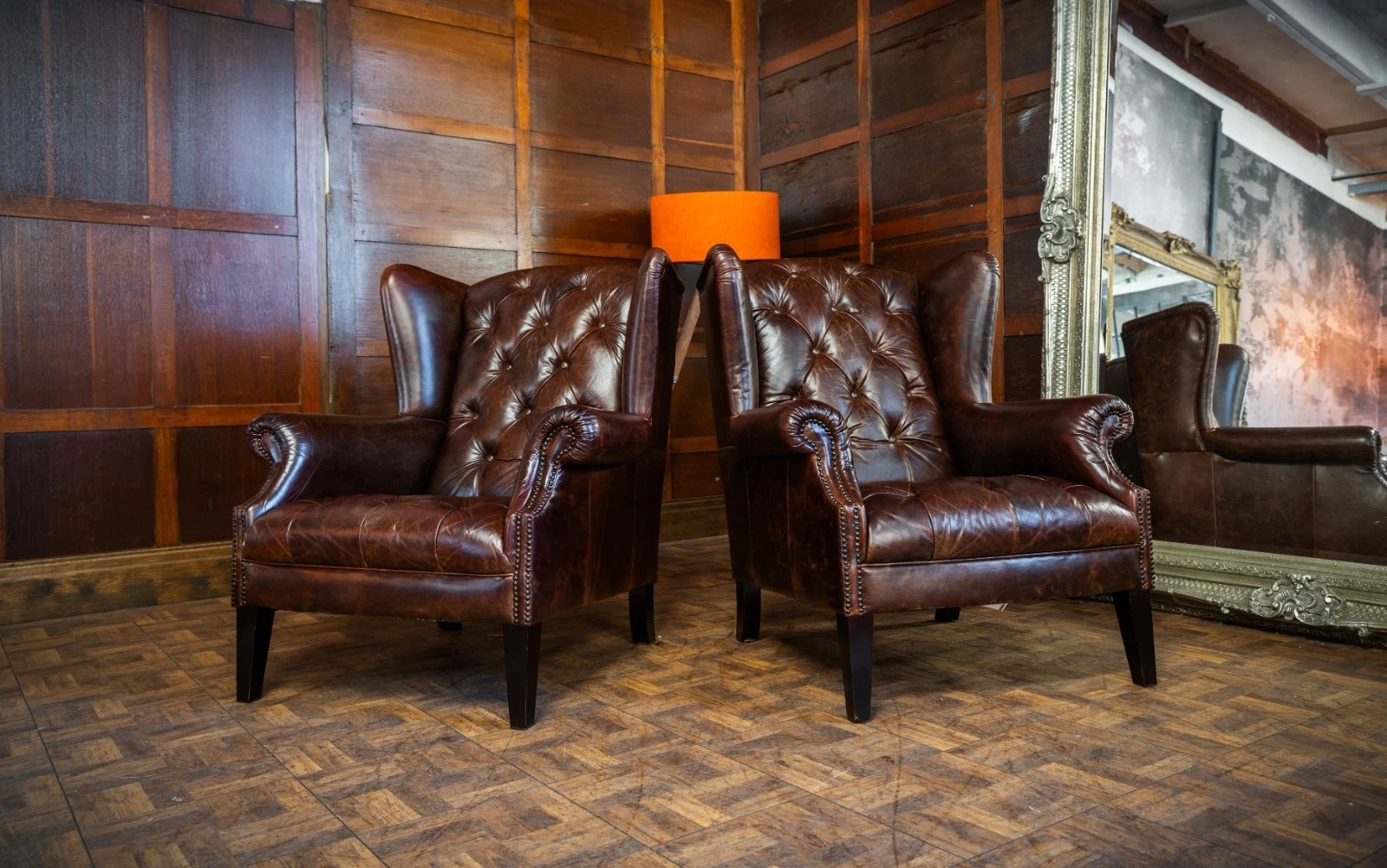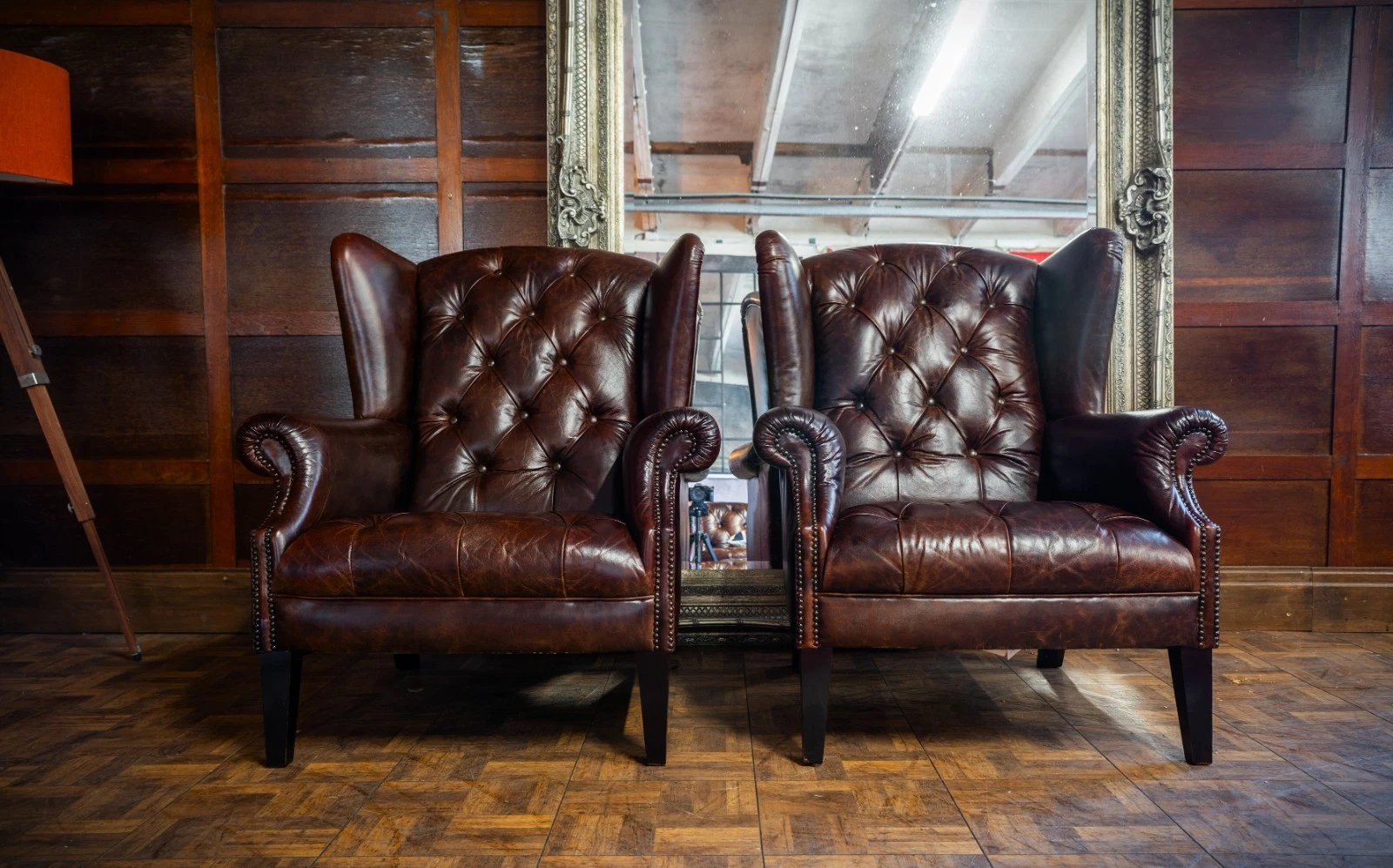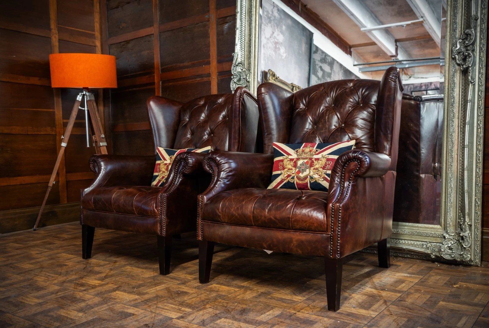 PAIR of TETRAD PALACE ANTIQUE BROWN LEATHER CHESTERFIELD WINGBACK LIBRARY CHAIRS