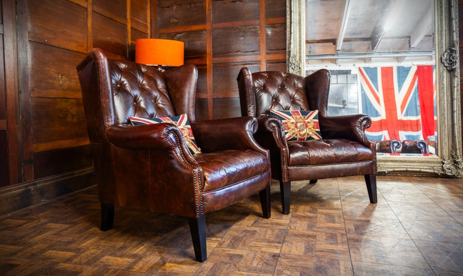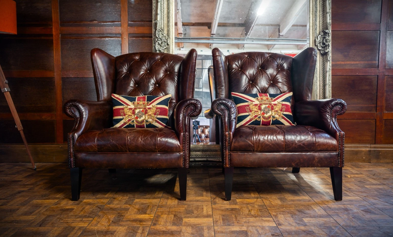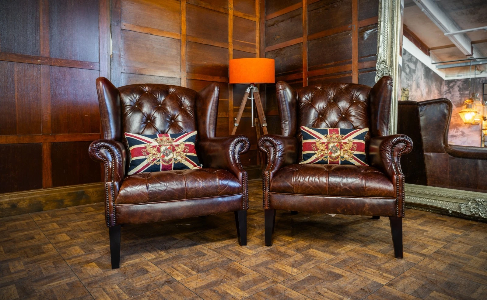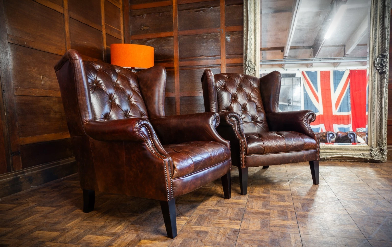 PAIR of TETRAD PALACE ANTIQUE BROWN LEATHER CHESTERFIELD WINGBACK LIBRARY CHAIRS