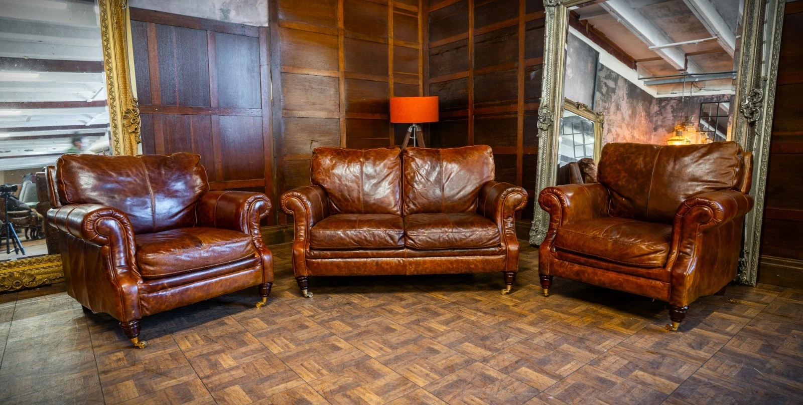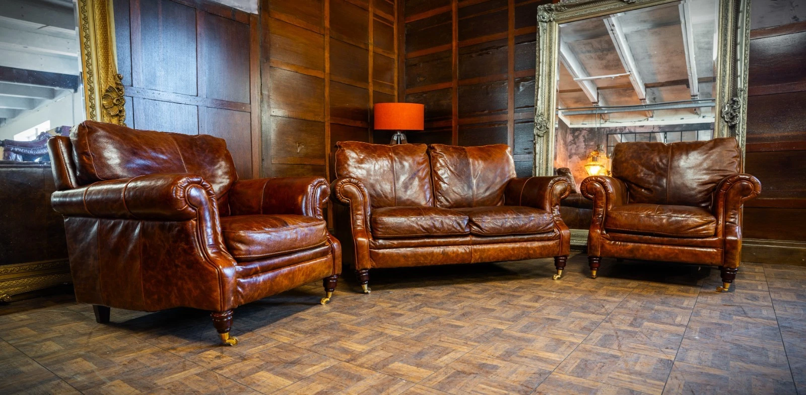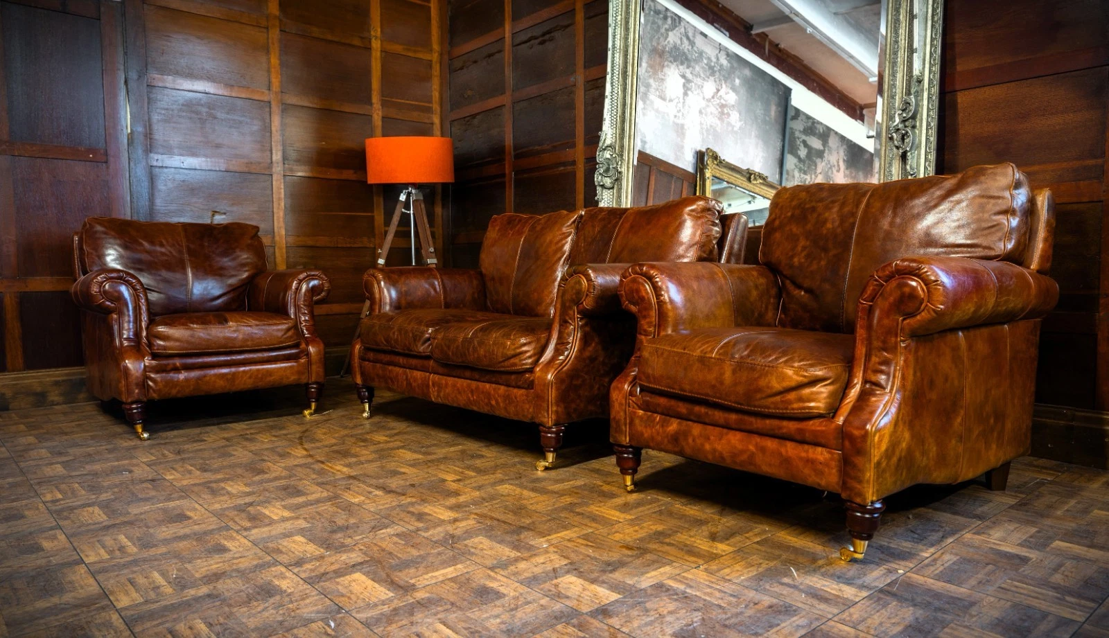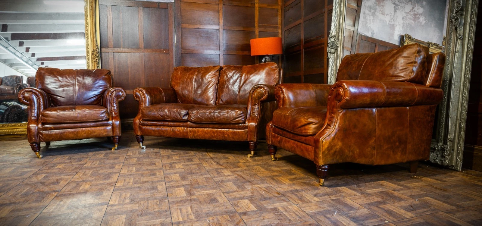 VICTORIAN STYLE ANTIQUE TAN LEATHER SUITE 2 SEATER CLUB SOFA & PAIR of ARMCHAIRS