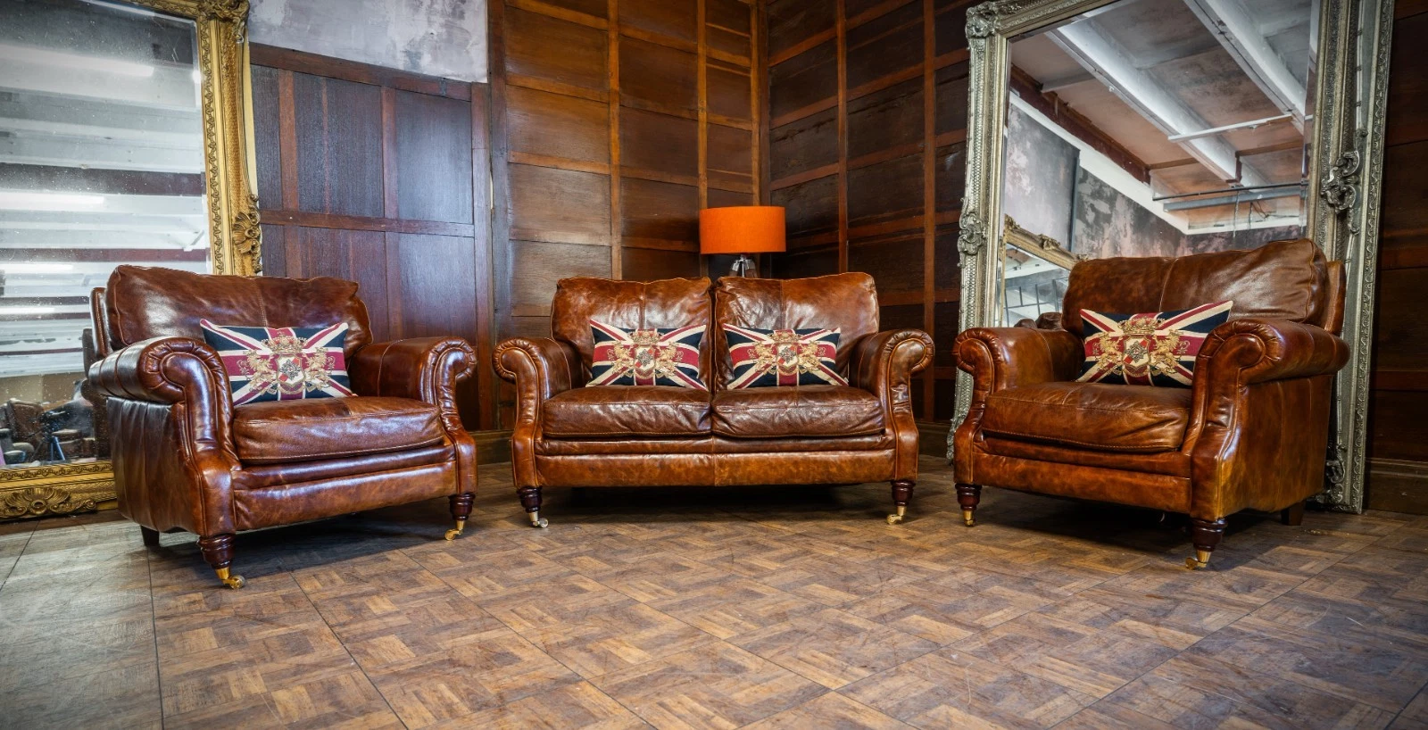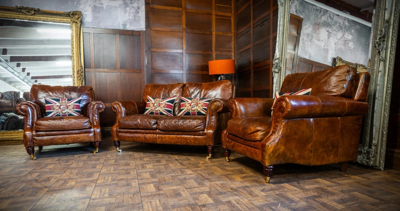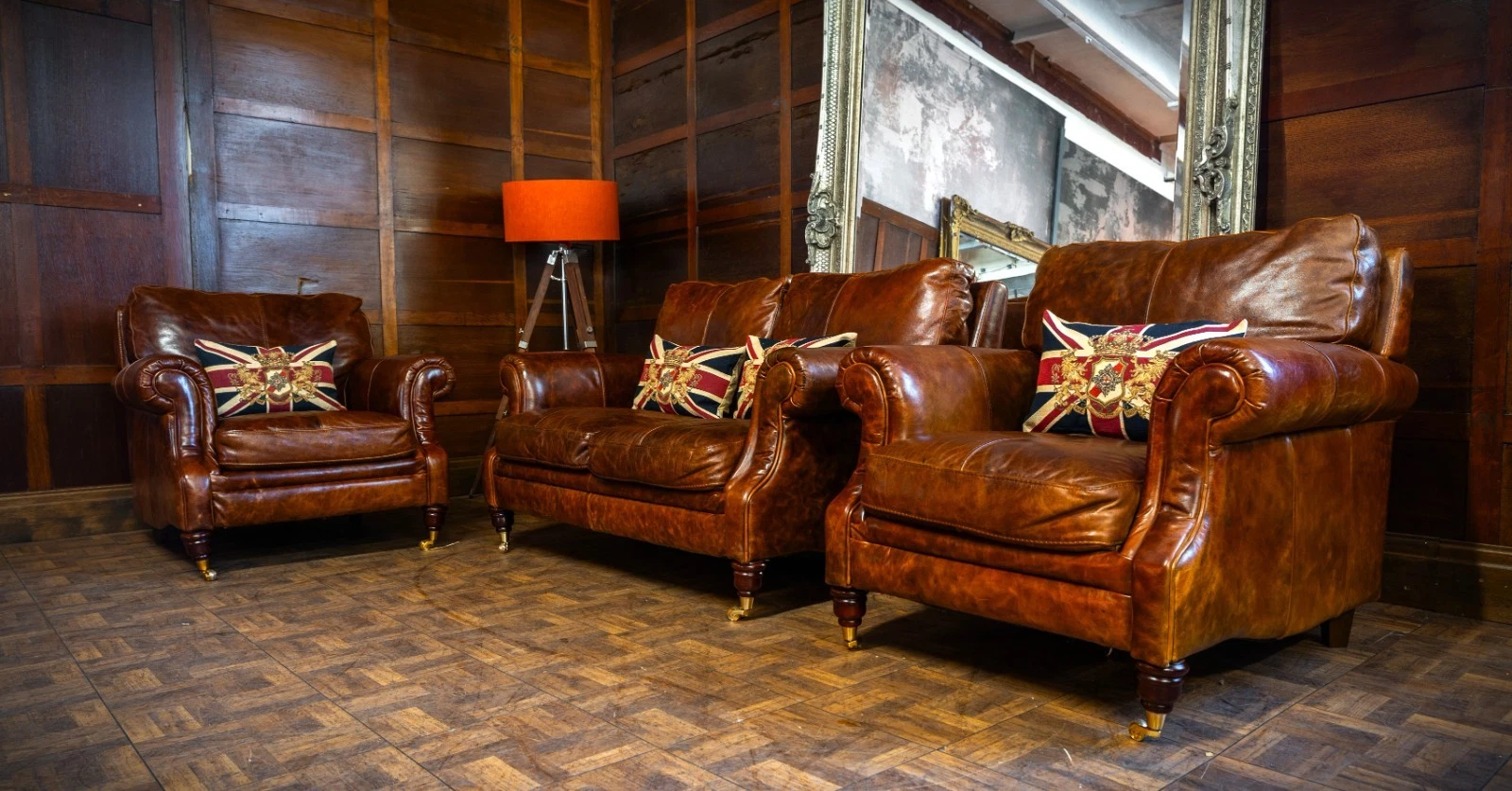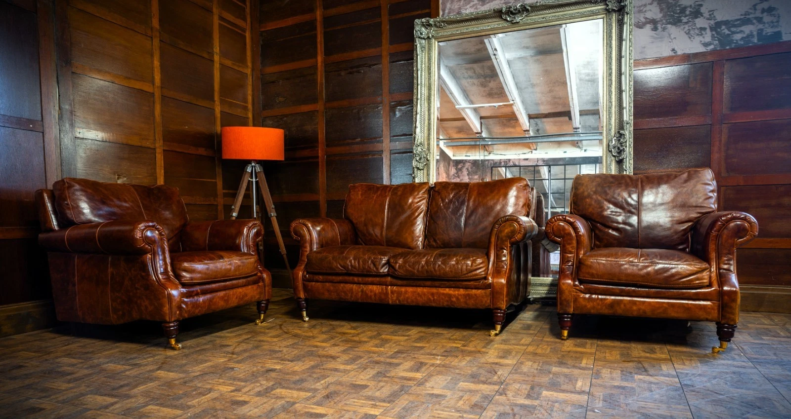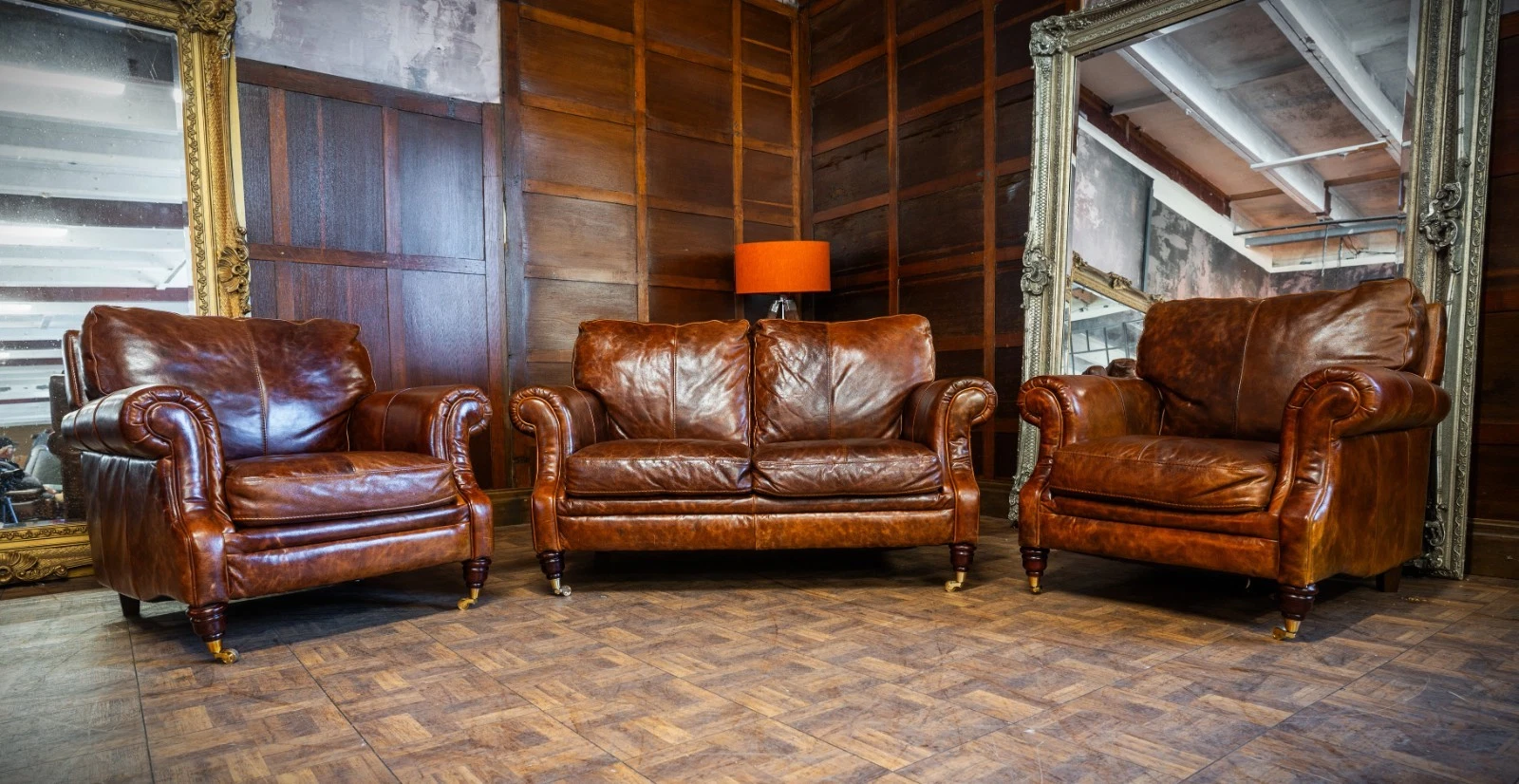 VICTORIAN STYLE ANTIQUE TAN LEATHER SUITE 2 SEATER CLUB SOFA & PAIR of ARMCHAIRS