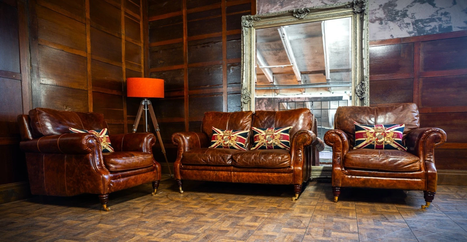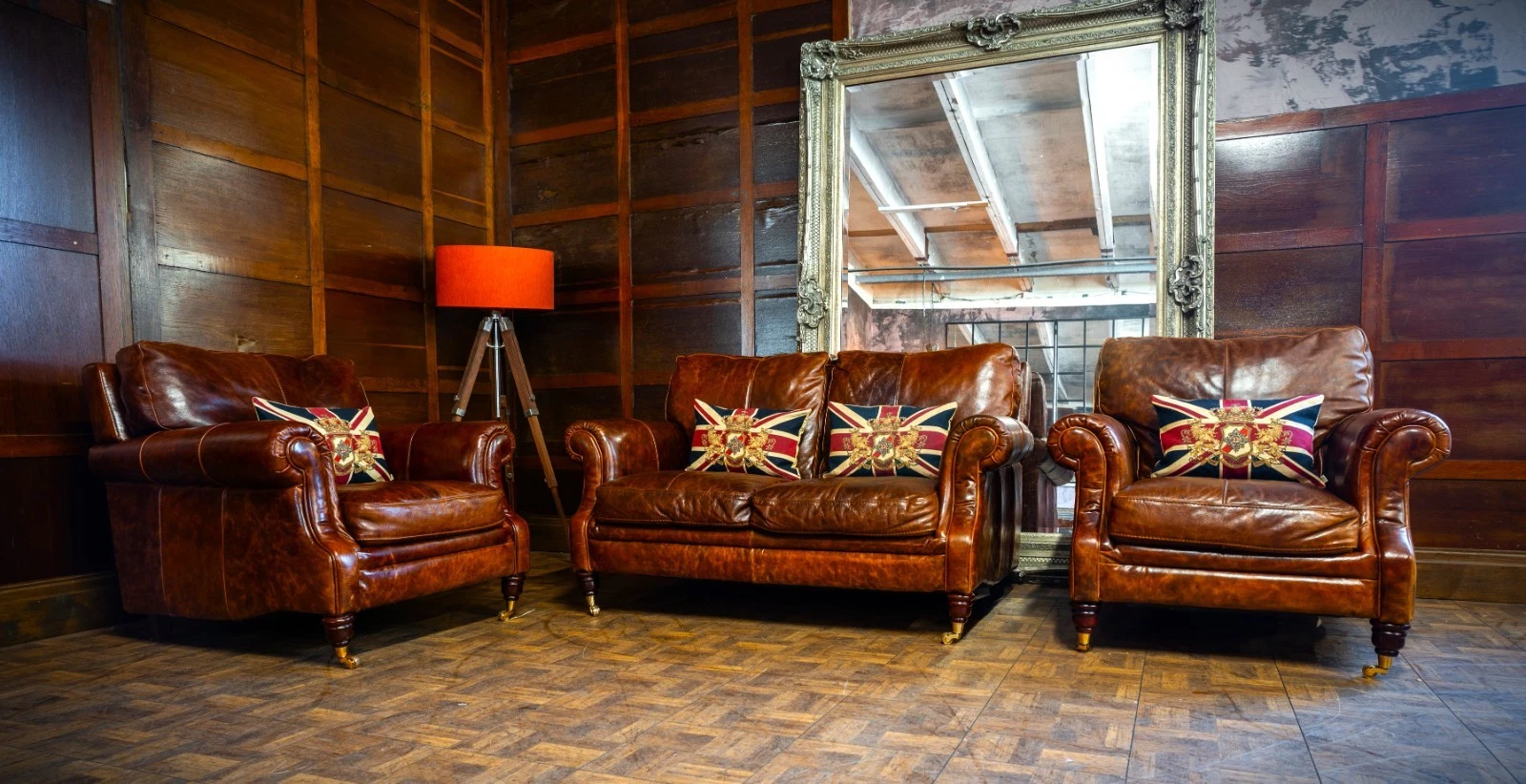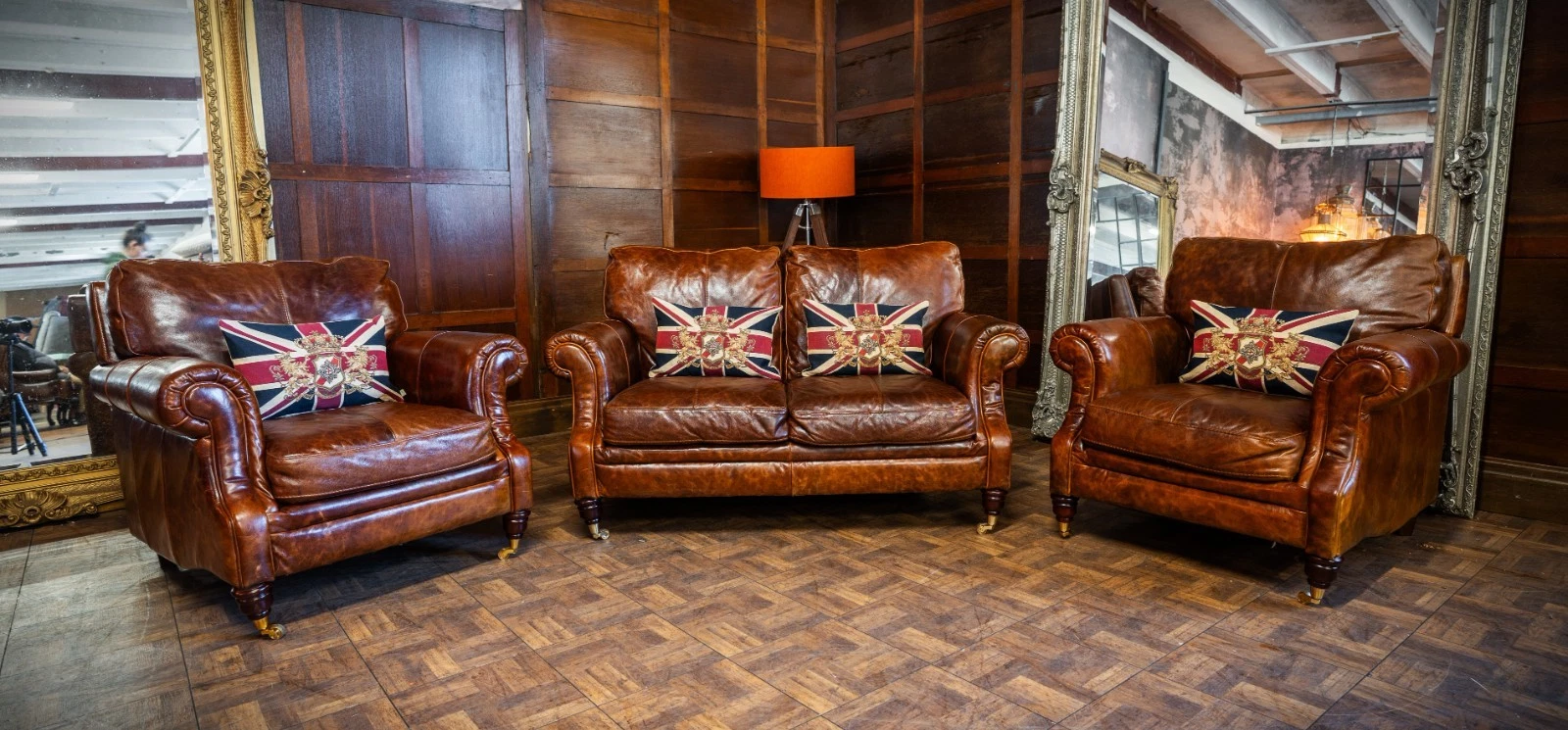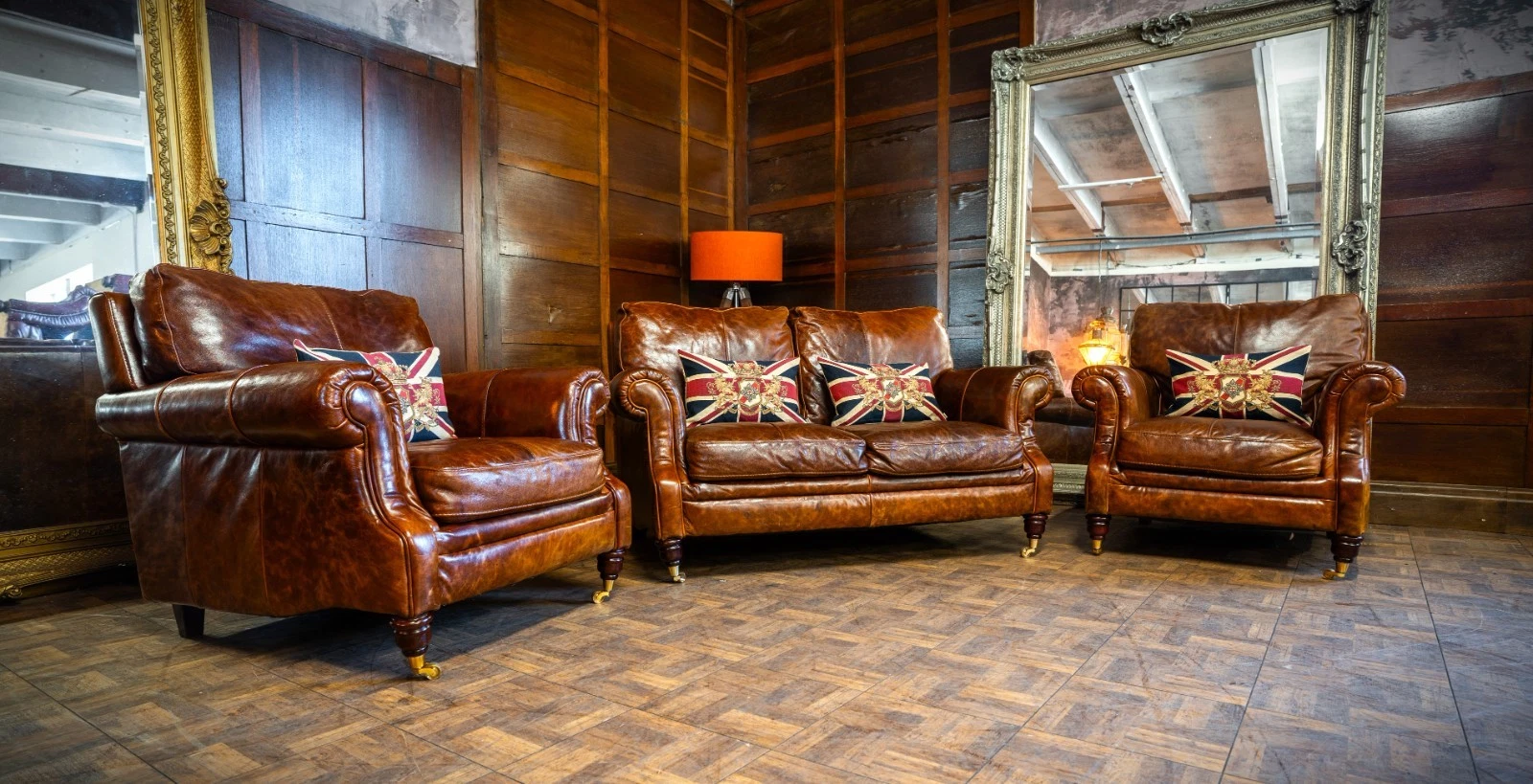 VICTORIAN STYLE ANTIQUE TAN LEATHER SUITE 2 SEATER CLUB SOFA & PAIR of ARMCHAIRS