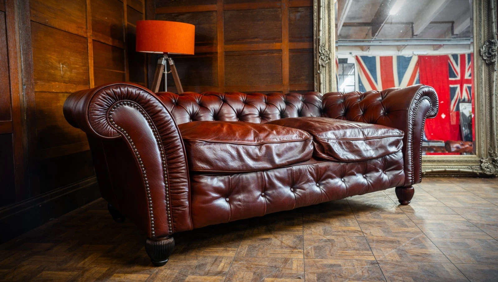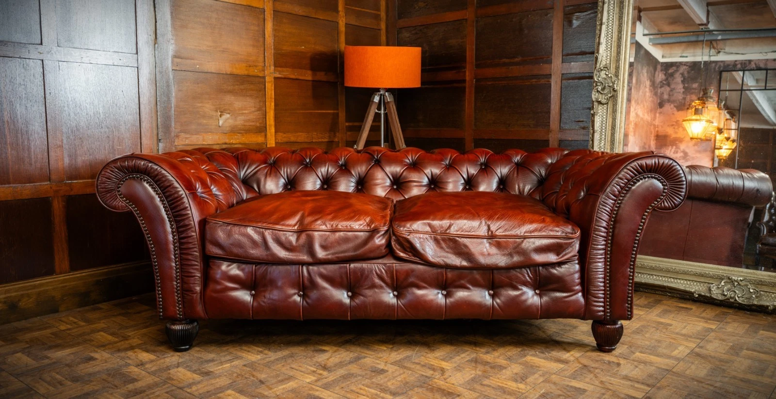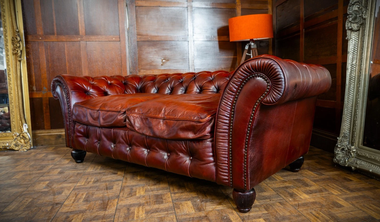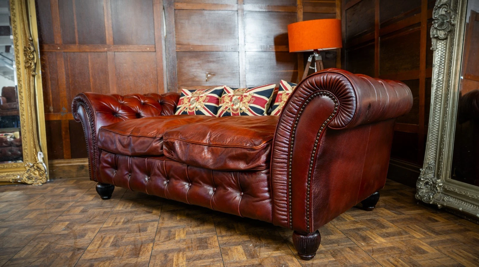 TETRAD ELLIOT ANTIQUE CHESTNUT LEATHER CHESTERFIELD 3 SEATER SOFA TWO of a PAIR