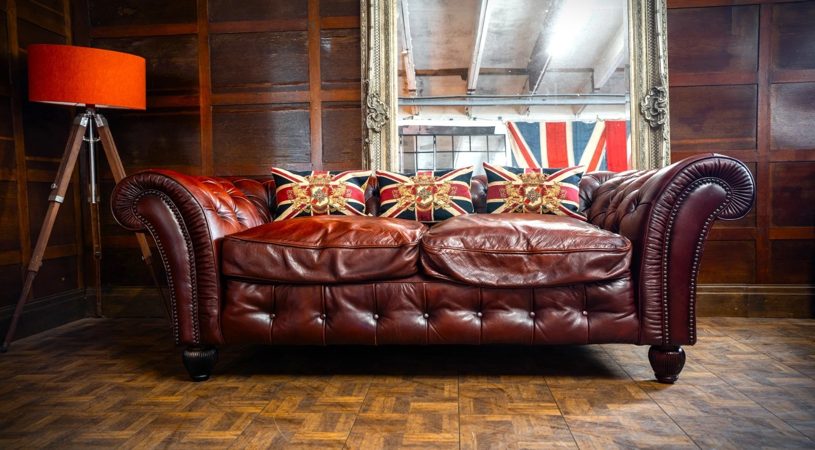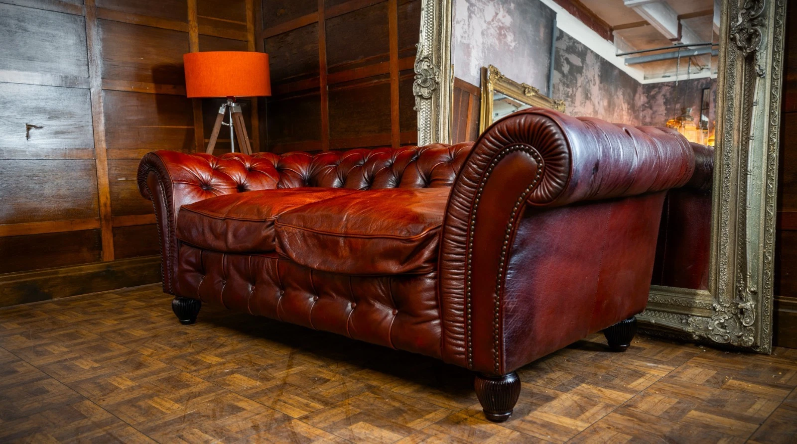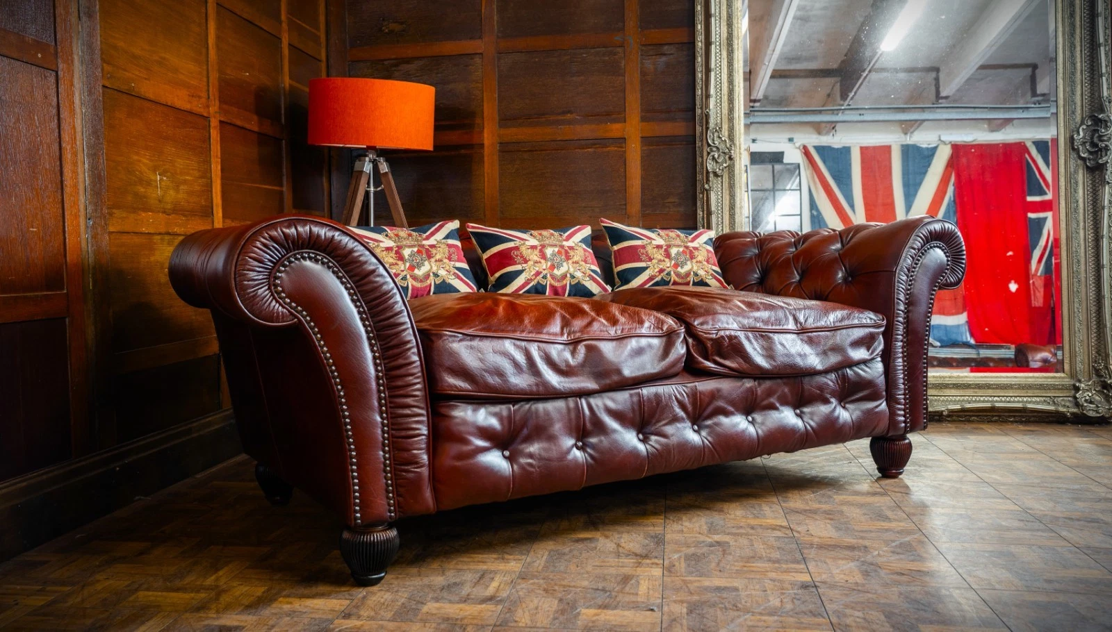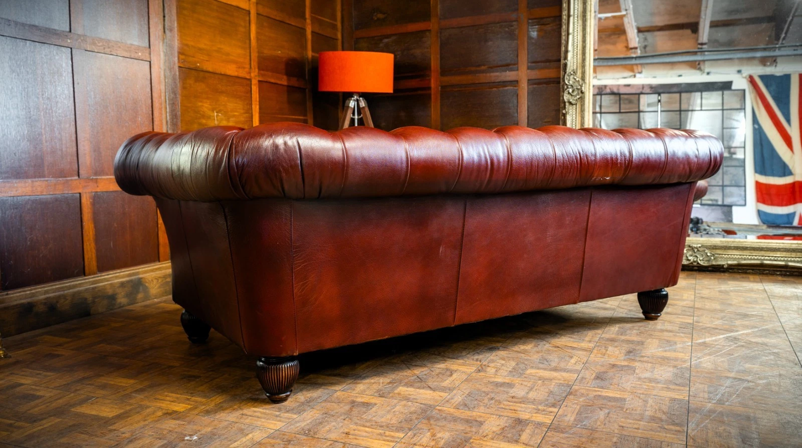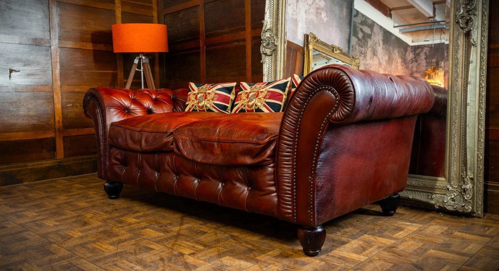 TETRAD ELLIOT ANTIQUE CHESTNUT LEATHER CHESTERFIELD 3 SEATER SOFA TWO of a PAIR