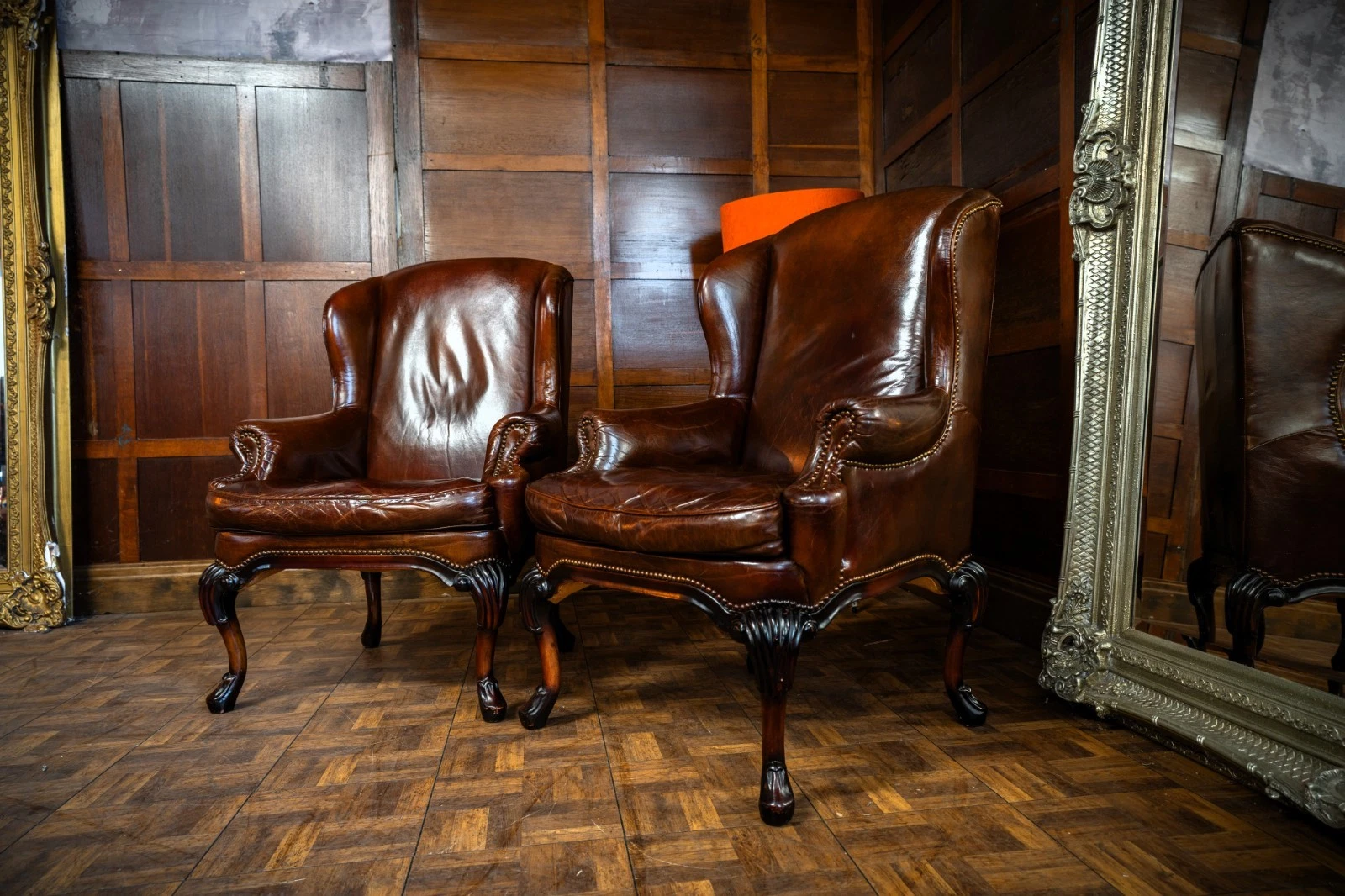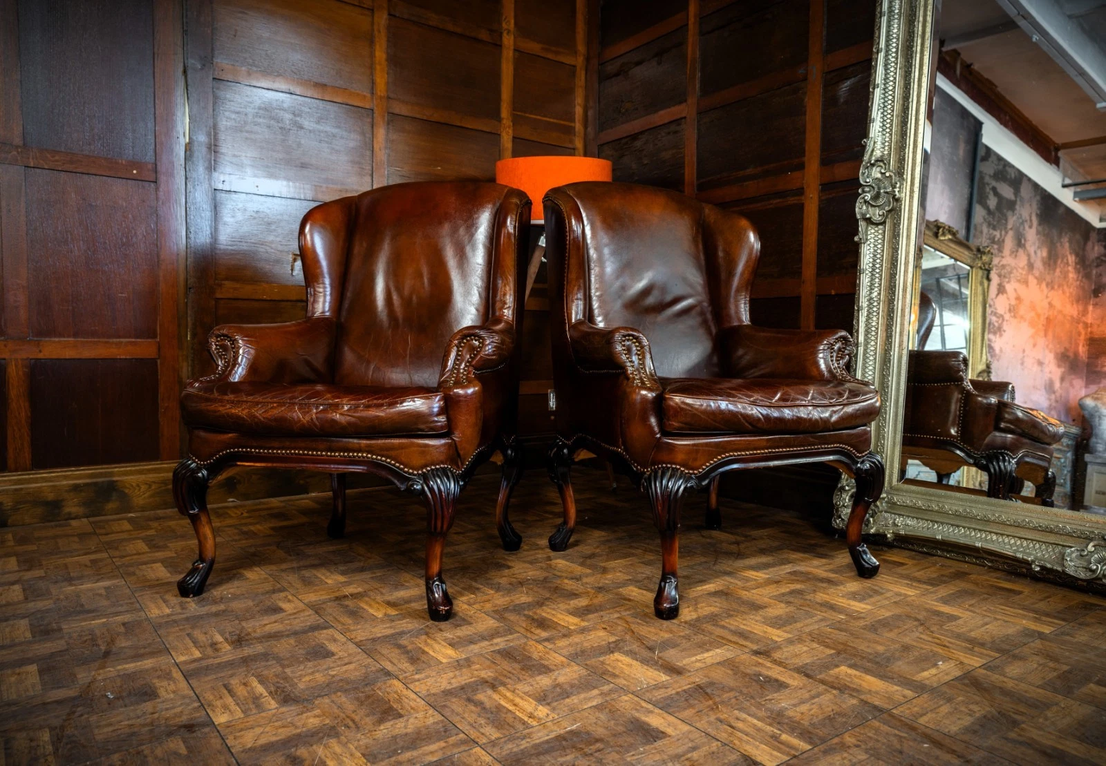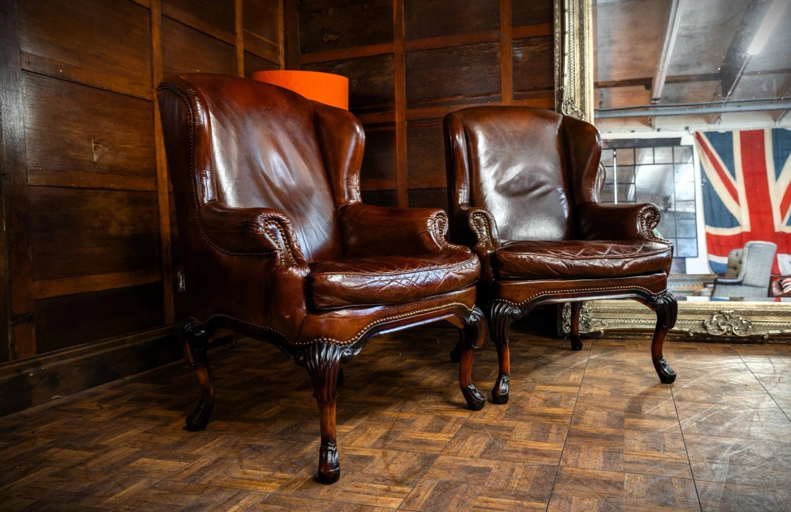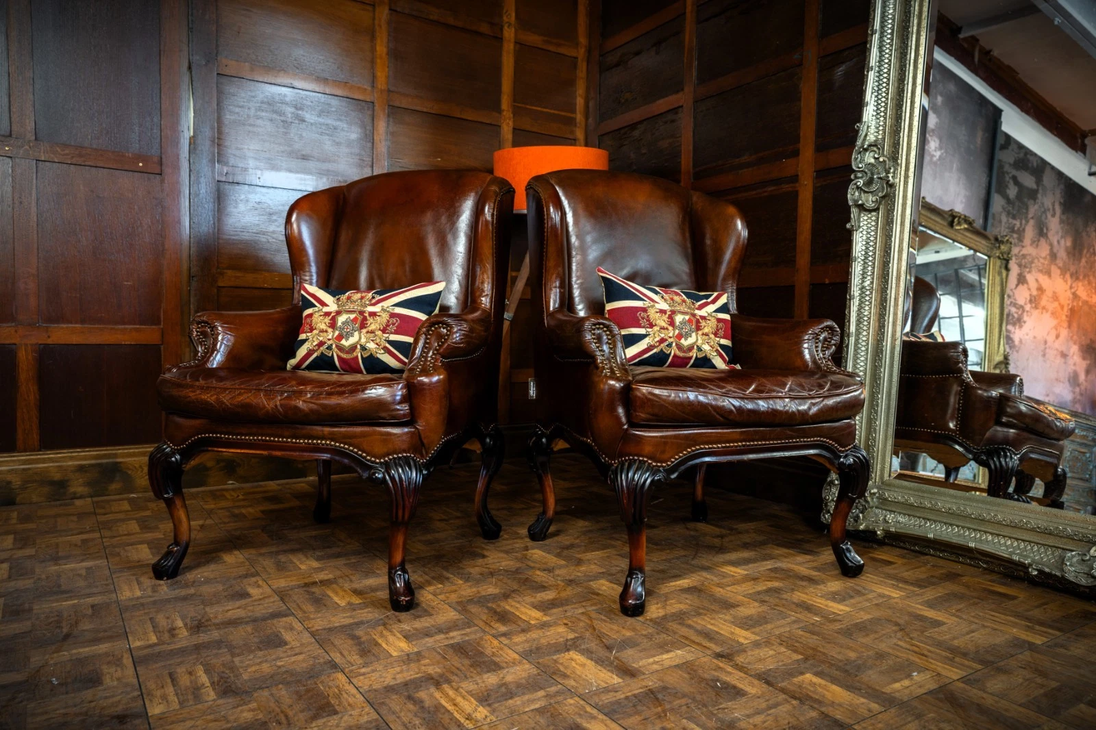 PAIR of HALO, TOMOTHY OULTON for ARTFORMA TAN BROWN CARVED & STUD DISTRESSED LEATHER CHESTERFIELD GEORGIAN LIBRARY ARMCHAIRS
