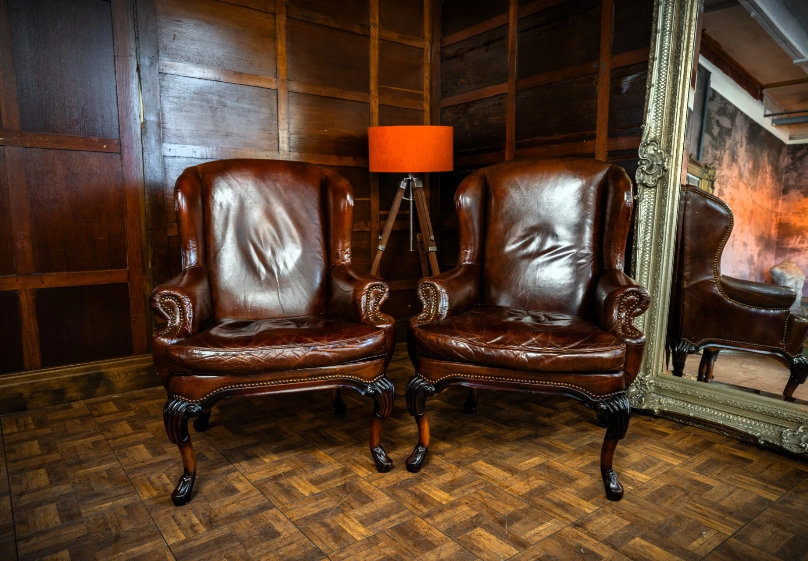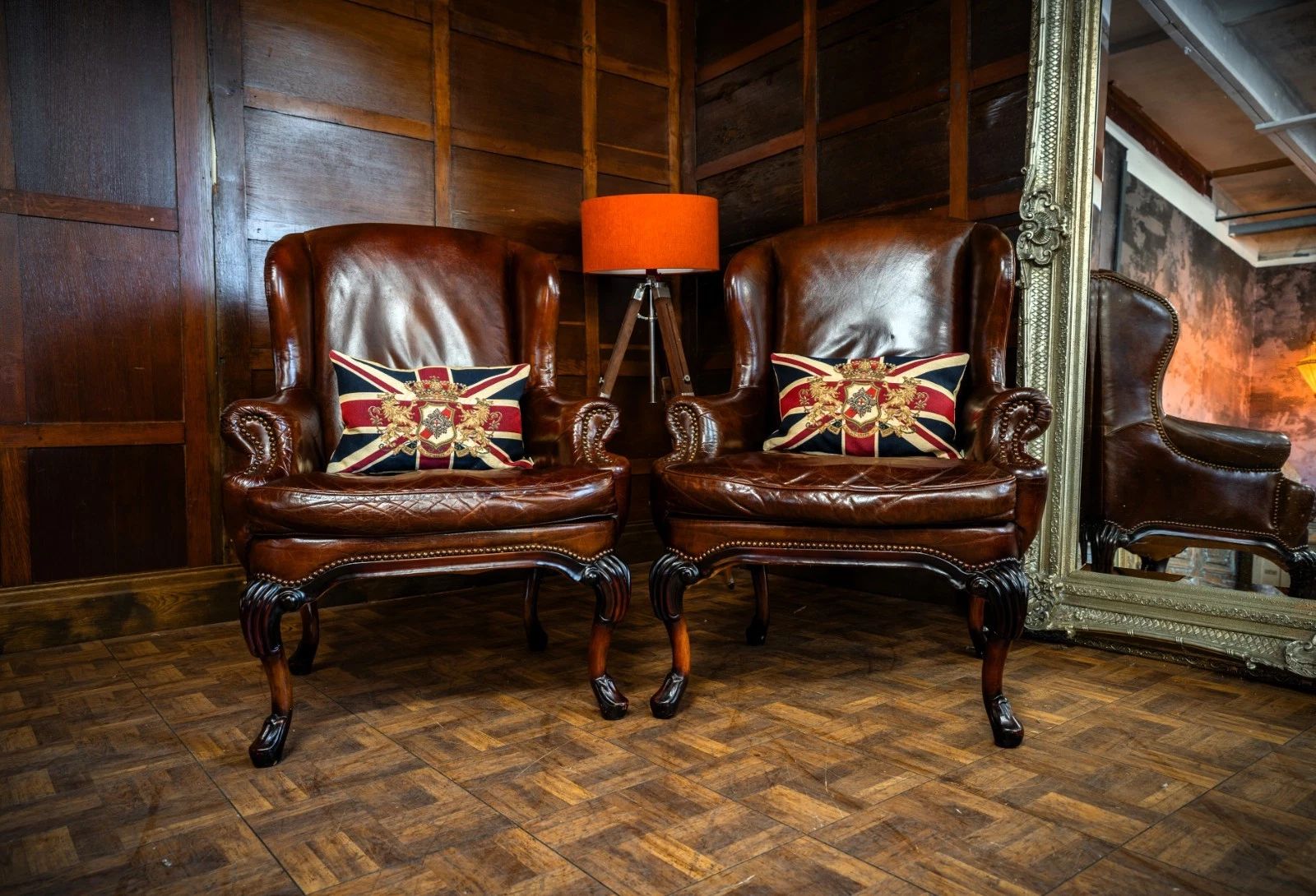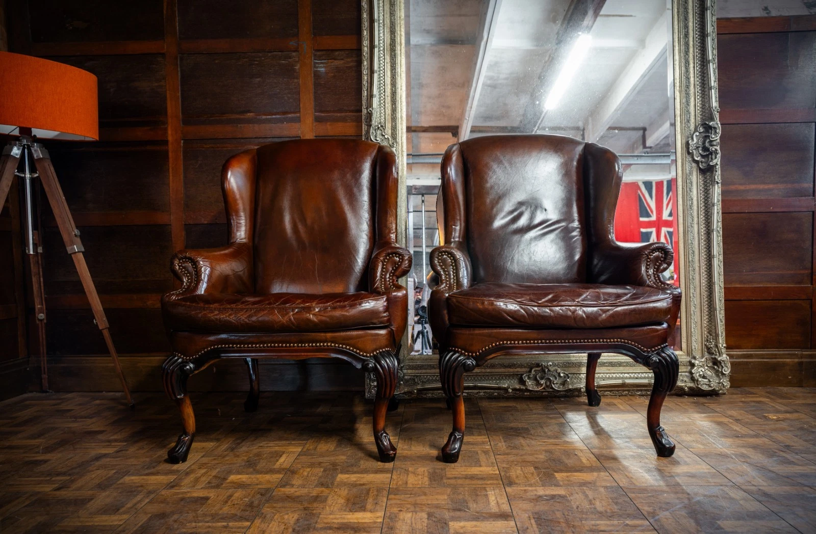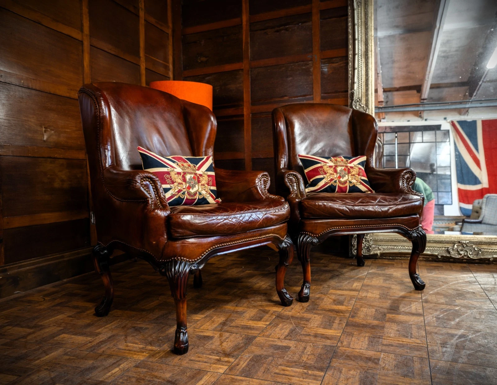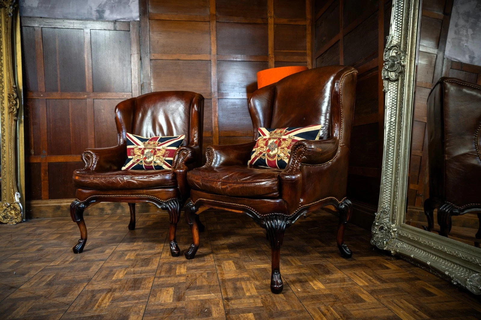 PAIR of HALO, TOMOTHY OULTON for ARTFORMA TAN BROWN CARVED & STUD DISTRESSED LEATHER CHESTERFIELD GEORGIAN LIBRARY ARMCHAIRS