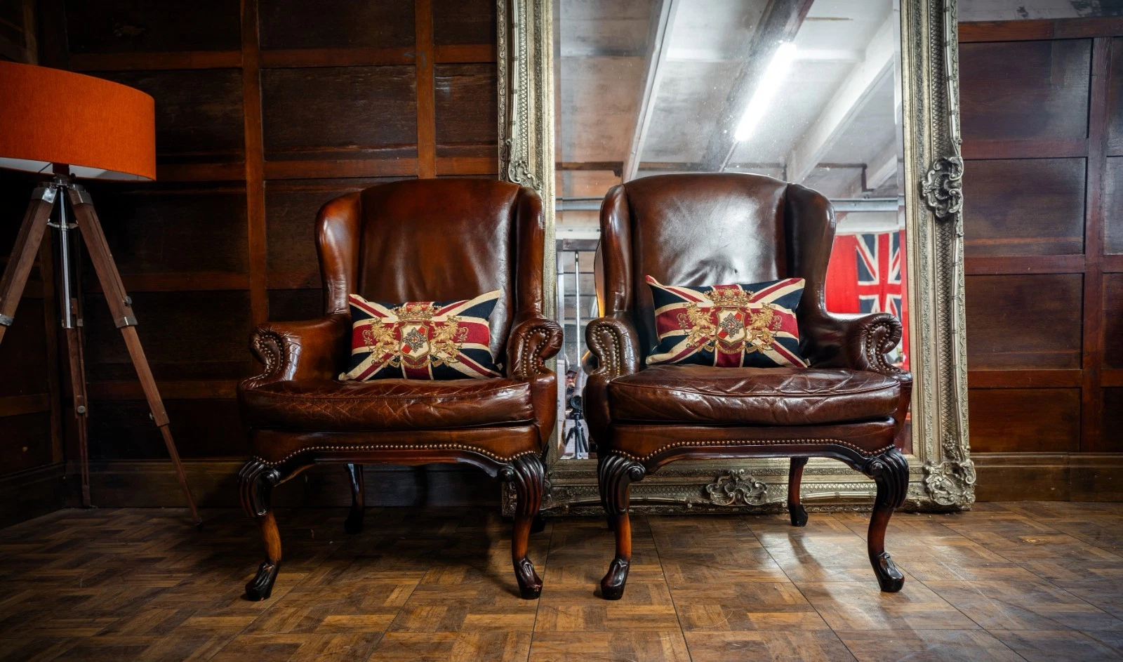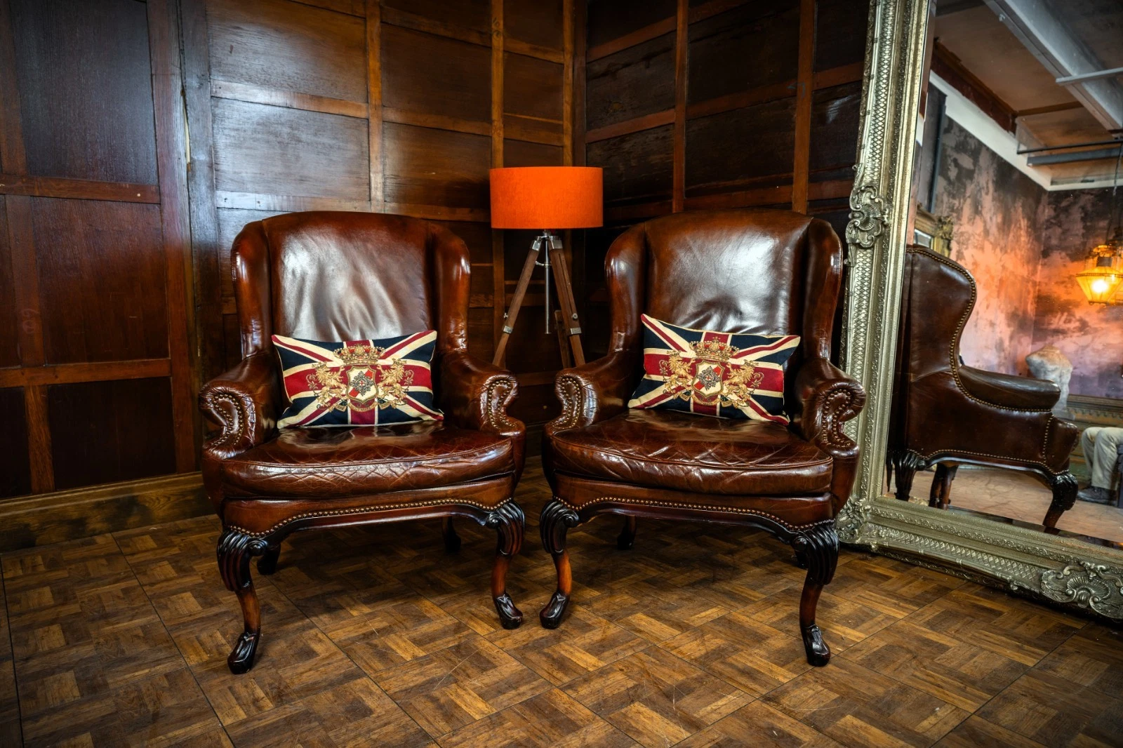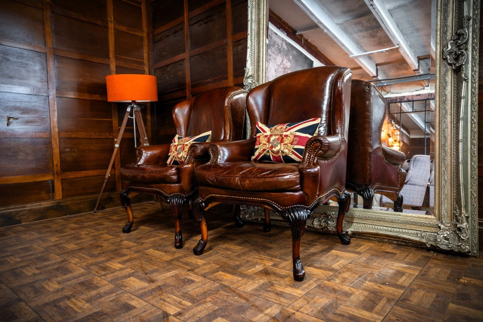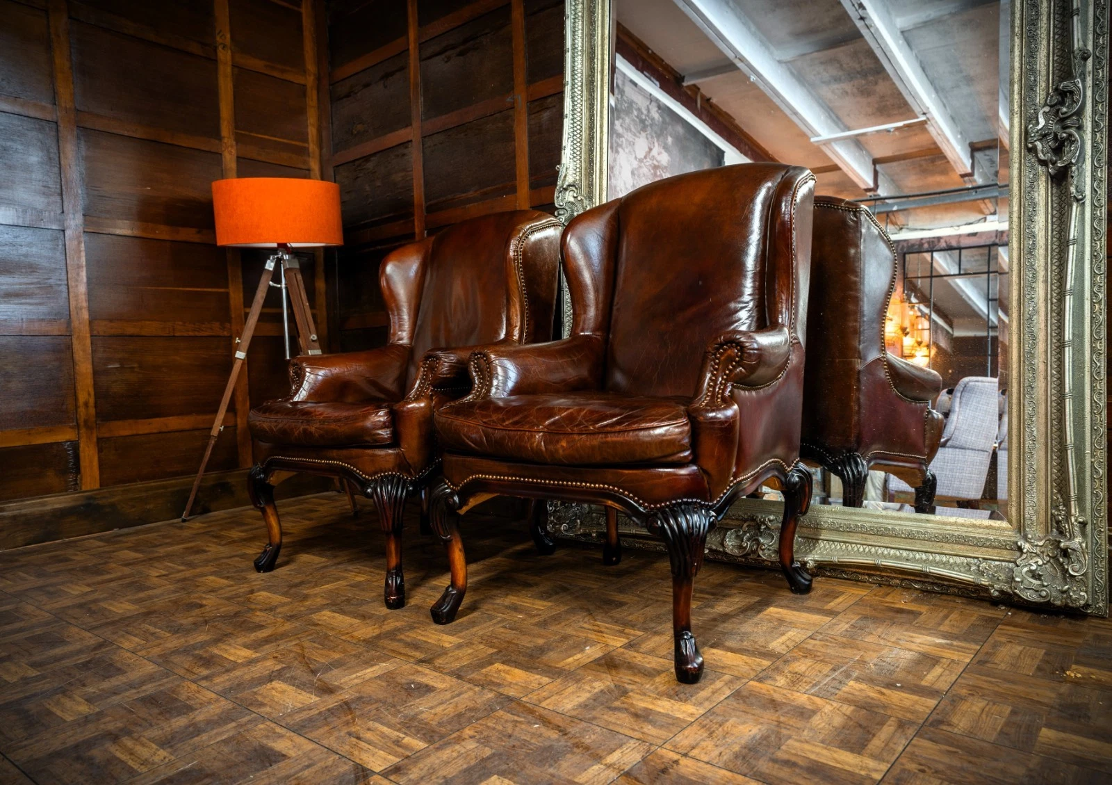PAIR of HALO, TOMOTHY OULTON for ARTFORMA TAN BROWN CARVED & STUD DISTRESSED LEATHER CHESTERFIELD GEORGIAN LIBRARY ARMCHAIRS