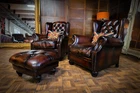 PAIR of TETRAD OSKAR ANTIQUE CIGAR LEATHER CHESTERFIELD WINGBACK CHAIRS & STOOL