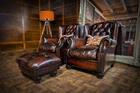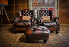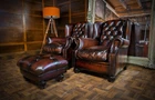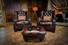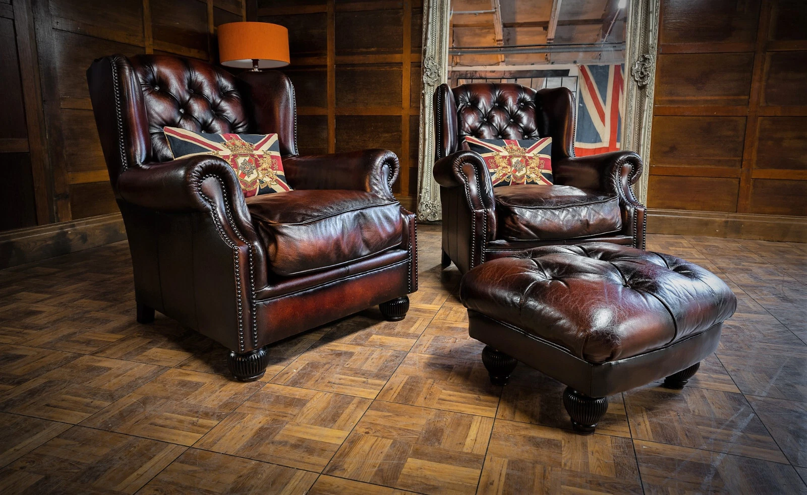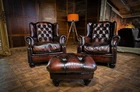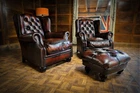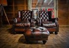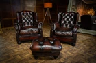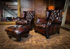 F50-160326/E- PAIR of TETRAD OSKAR ANTIQUE CIGAR LEATHER CHESTERFIELD WINGBACK CHAIRS & STOOL